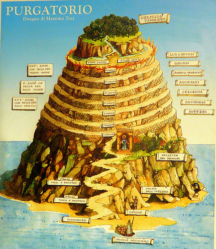 Jill and I have been talking about doing some aesthetic redesigning around here. We are grateful for the template that WordPress provides, but we’ve been getting a little tired of the canned pictures and want to do more to personalize the site. So for now we’ve got some of the Purgatory signs up in our header, and we’re interested in maybe using some medieval images of Dante’s Purgatory Mountain, like this one: