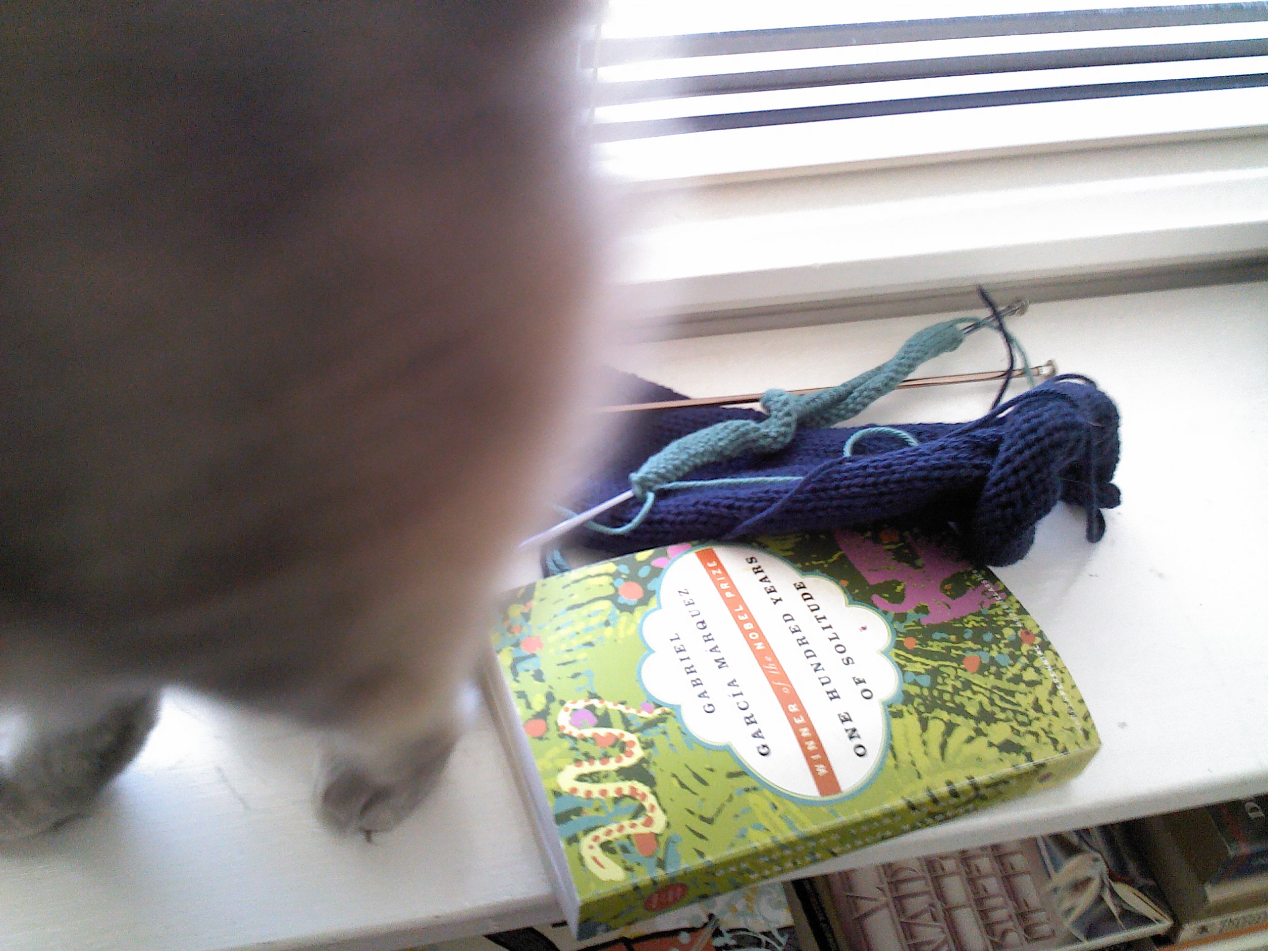I always marvel at how well Jill gets her cats to sit still for pictures. My cat Emma never sits still, ever, and my cat Cleo likes to lick cell phones and cameras, so whenever I try to take her picture it ends up being a shot of her open mouth as she lunges forward to take a taste. Yesterday when I was taking my Yarn Along photo, Emma showed up and planted herself right on top of my knitting, and I thought I might have a chance of getting her into the photo.