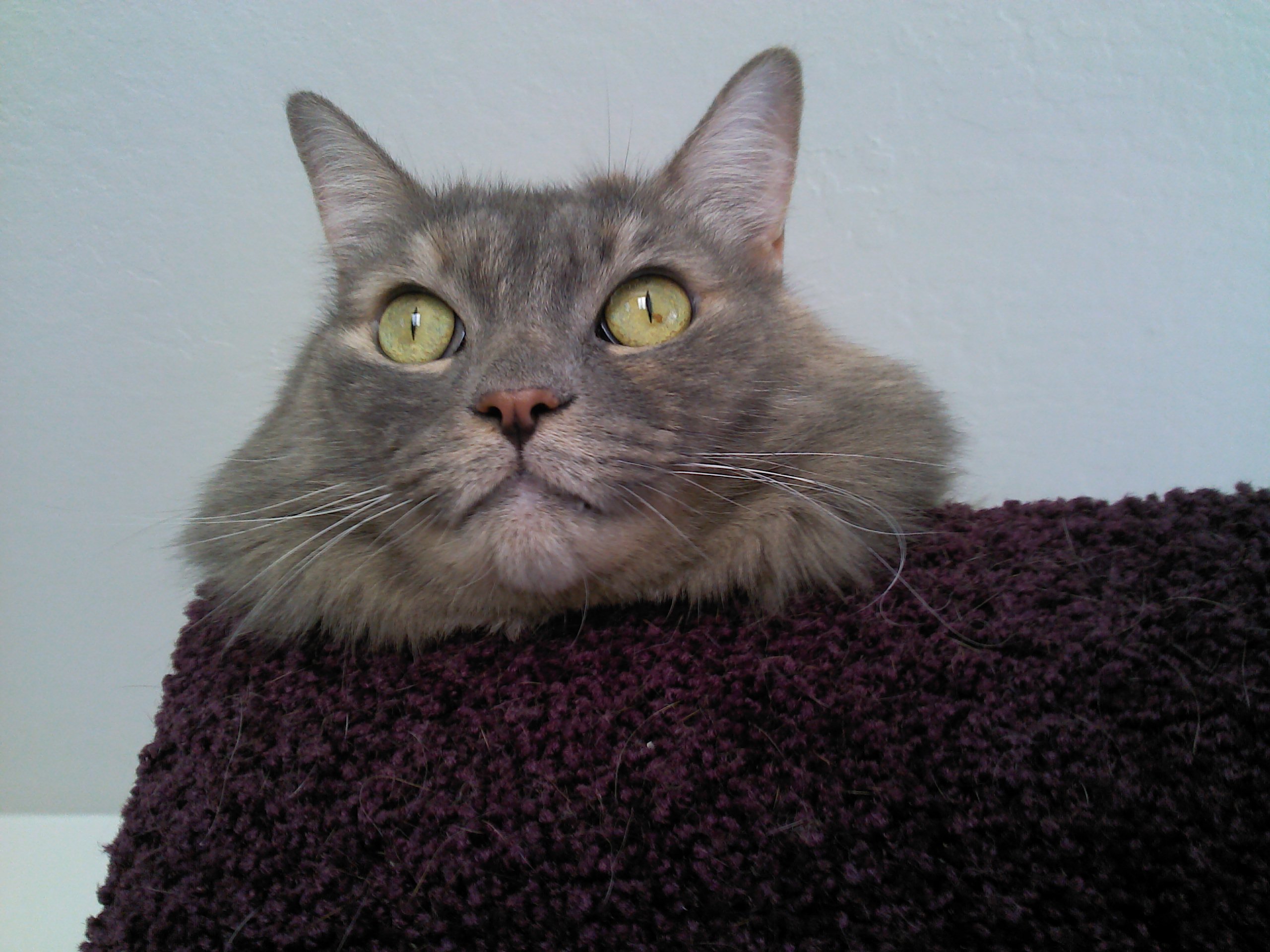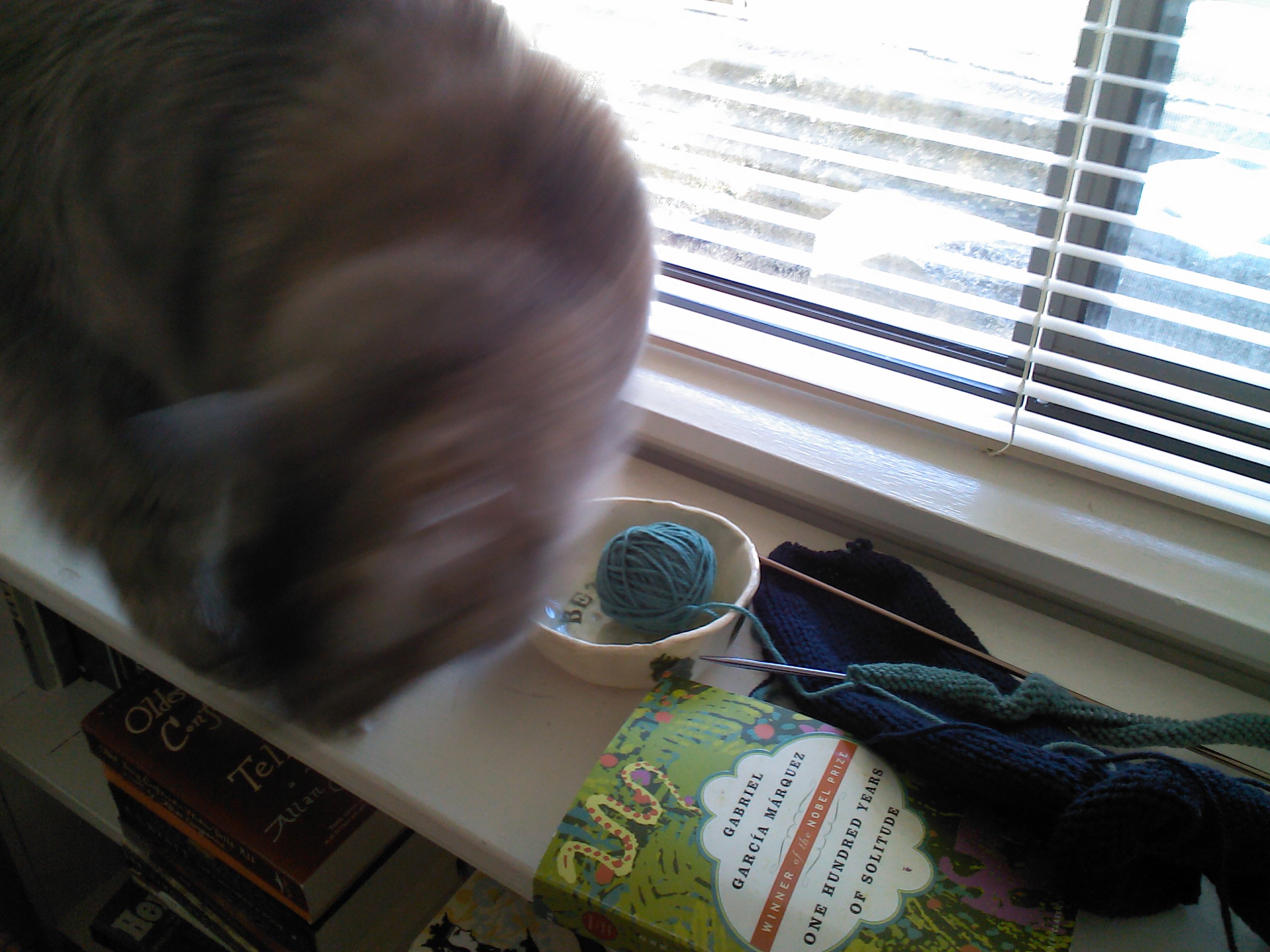 All she wanted to do was pace back and forth over the knitting and the book, just to make sure they weren’t getting more attention than she was. Then she jumped up on her climber and rested her chin on the edge, and I was able to get this shot – which, no joke, is probably the clearest, most focused photo of her I have taken in the eight years I’ve had her: