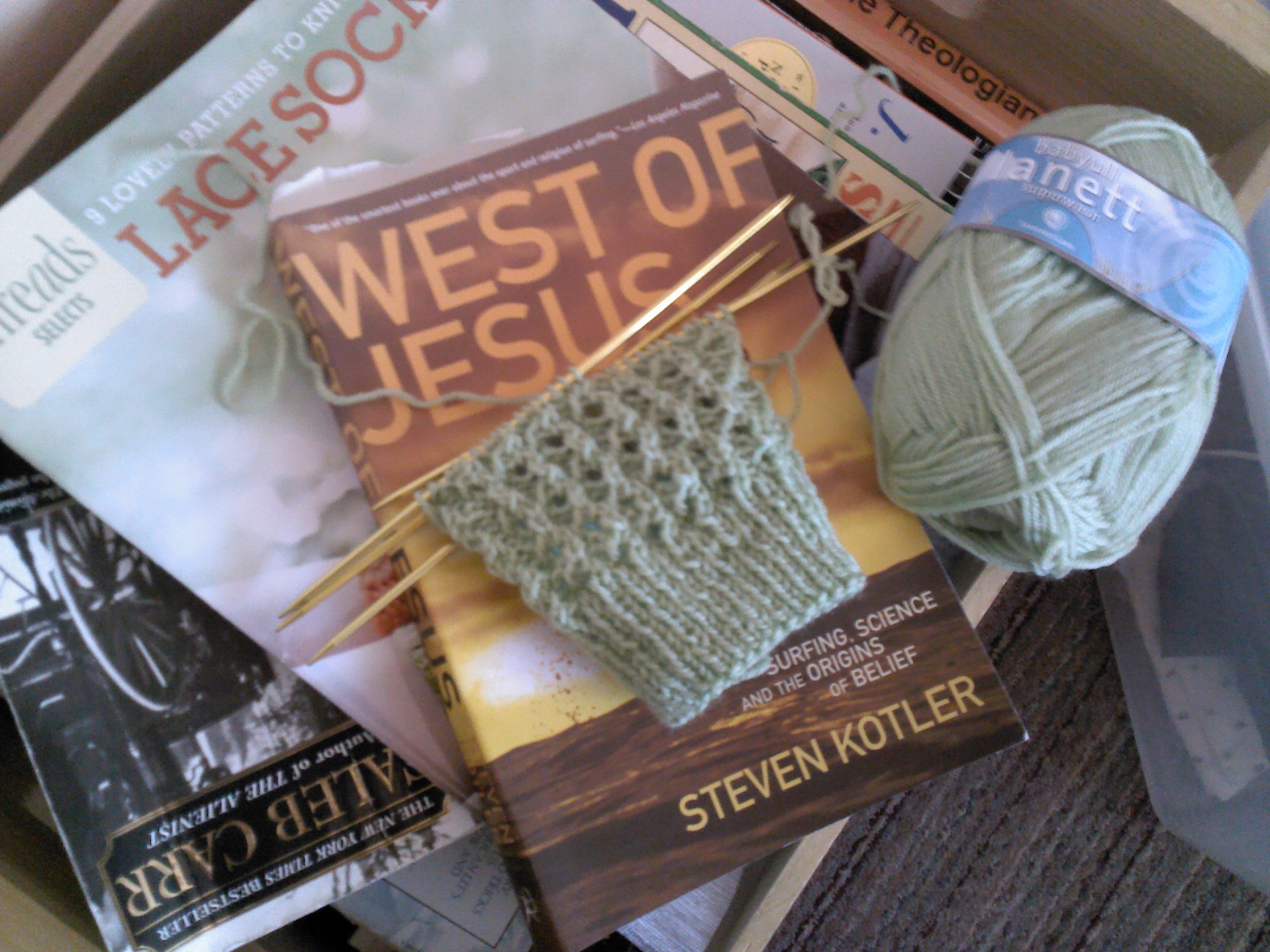 The book in the photo is Steven Kotler’s West of Jesus: Surfing, Science, and the Origins of Belief. This book has been on my shelf for years, largely unnoticed, and on Sunday I found it at a moment when I really, really needed it. Those kinds of discoveries happen to me quite often and are, as far as I’m concerned, the primary reason to keep a large home library. Libraries and bookstores are there for me when I want books, but how many times have I needed books at those moments when bookstores and libraries aren’t accessible: in the middle of the night, when cars are broken, when I am far away from anywhere, either literally or figuratively. This is a memoir about the way Kotler used surfing to rebound after a health crisis that brought him to an absolute personal and professional low point. It’s also about the things that human beings choose to invest with religious significance. It’s about God and gods and shamans and weather and oceans and Joseph Campbell and mythic heroes and people who give up everything else in life to float around in a dangerous ocean on a little tiny board in recognition of the fact that that’s what we’re all doing, really, and sometimes it’s a good idea to acknowledge that reality. It’s a good book. I recommend it.