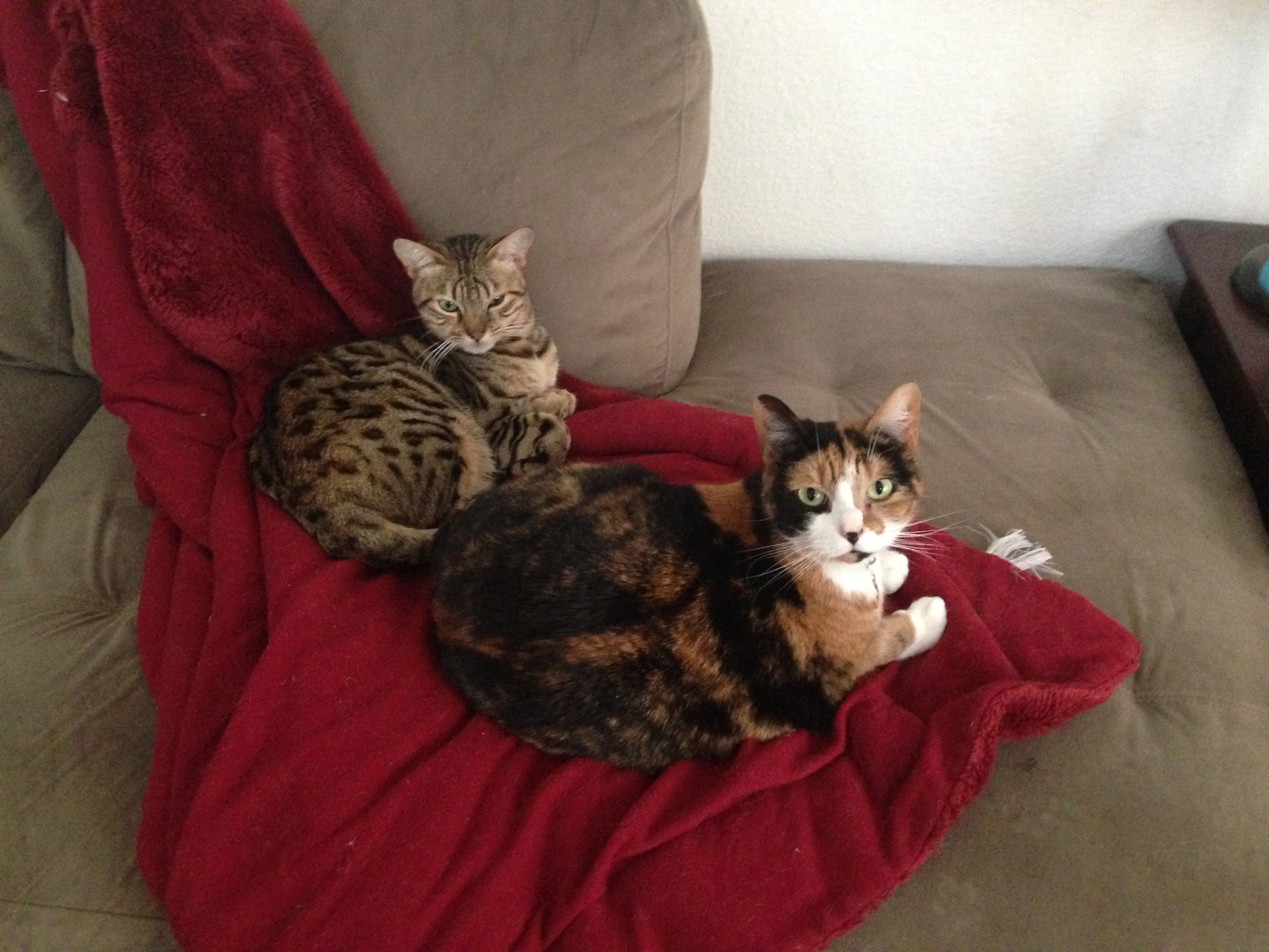 And here are two of my cats, Jasper (the bengal) and Sabrina (the calico). They are both cats I adopted from my hospital. Sabrina came in as a stray in 2008 with a degloving injury to her tail. So now she doesn’t have a tail. Jasper got dumped outside my hospital in a carrier with three of his littermates. We assume there was a bengal breeder in the area who ran out of room or something of the sort.