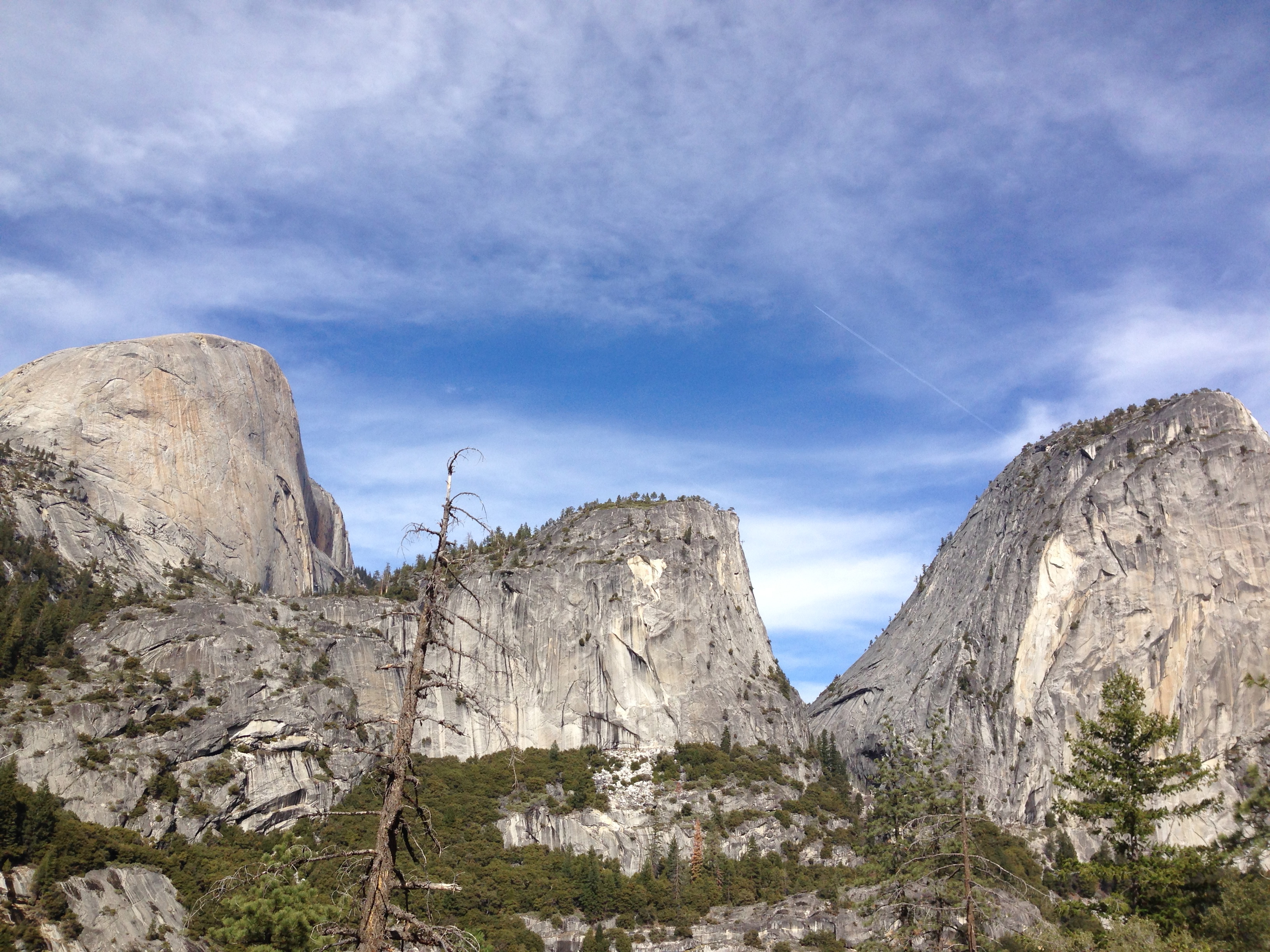 This is a view of Half Dome’s back side (left), Mount Broderick (middle), and Liberty Cap (right), taken from the top of Nevada Falls.