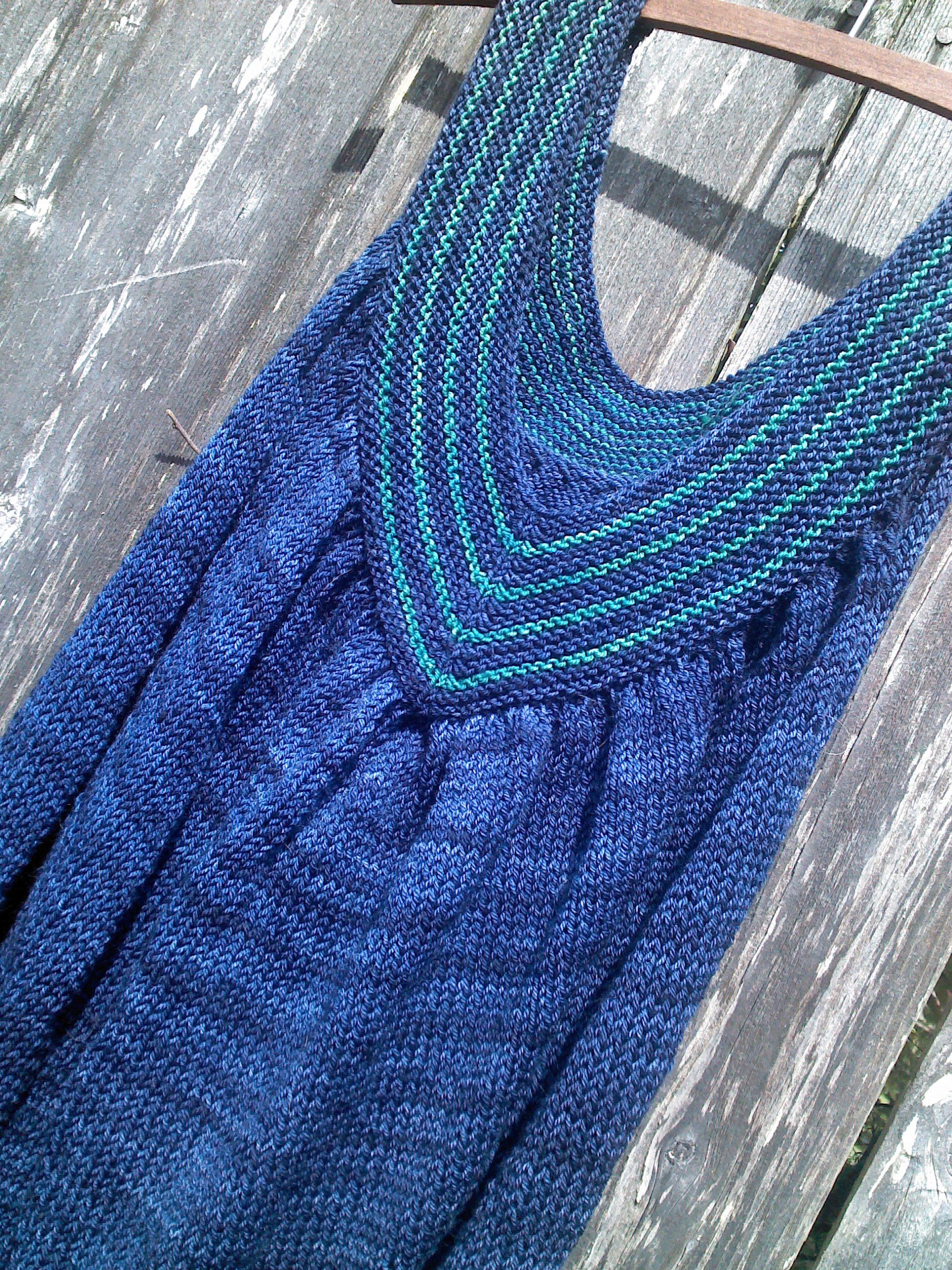 The blue tank sweater that I’ve been working on for the last several weeks is DONE. Here it is: