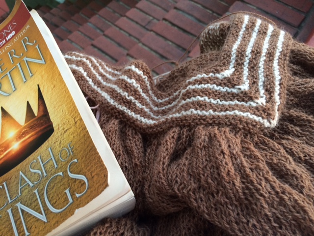 My tan sweater and my copy of A Clash of Kings are like siblings on vacation: Seriously, Mom? Another group photo? I have promised them that I will finish one of them this weekend. Which will it be – the sweater or the book? My money is on the book. Because incest and possible zombies and witty dwarf.