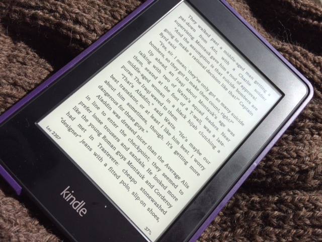 I haven’t made much progress on my sweater this week thanks to the whirlwind cross-country trip I took this past weekend, but I am reading a very good book: War of the Encyclopaedists by Christopher Robinson and Gavin Kovite. This book is so good that I didn’t even buy a single book at the awesome used book store in the Milwaukee airport. I’m reading it on my Kindle, so here’s a photo of the Kindle alongside a close-up of my English rib sweater that really shows off its texture. A sleek image of modernity overpowering the contours of tradition, and so forth.