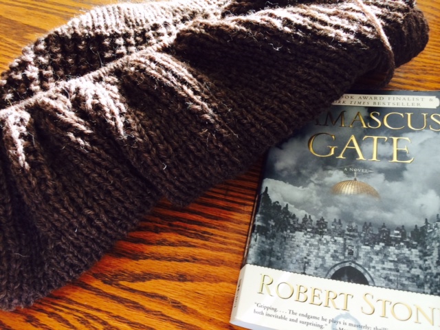 This is all a long way of saying that I have found yet another way to photograph the brown sweater that I’ve been knitting since before Daylight Savings Time. Yep, here it is – and yes I did work on it this weekend, quite a lot – on the coffee table in the kitchen with some evening sunlight slanting down in an Emily-Dickinson sort of way. I’m reading Robert Stone’s Damascus Gate and not liking it as much as I wish I were, but I’m only about a fifth of a way through it, so I’m giving it a chance.